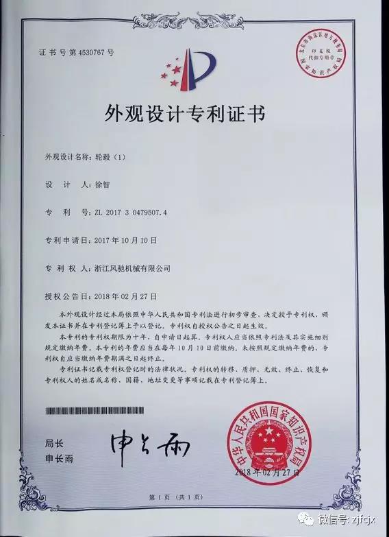 2018年3月榮獲“輪轂”外觀設計專利證書